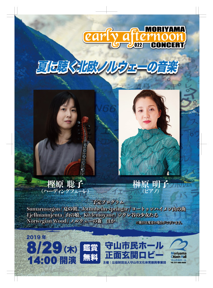 8月29日(木)14:00から滋賀県守山市市民会館ロビーにて1時間ほどのロビーコンサートで演奏します。共演は前回と同じくピアノの榊原明子さん。「夏に聴く北欧ノルウェーの音楽」と題し、お話を交えながらのコンサートです。お近くの方、入場無料ですので是非お運び下さい。また、開演前にノルウェーで撮りためた写真の一部をスライドにして上映致します。ノルウェーに行ったことのある方は思い出を辿って、行ったことのない方も想像を膨らませて楽しんでいただければと思います。