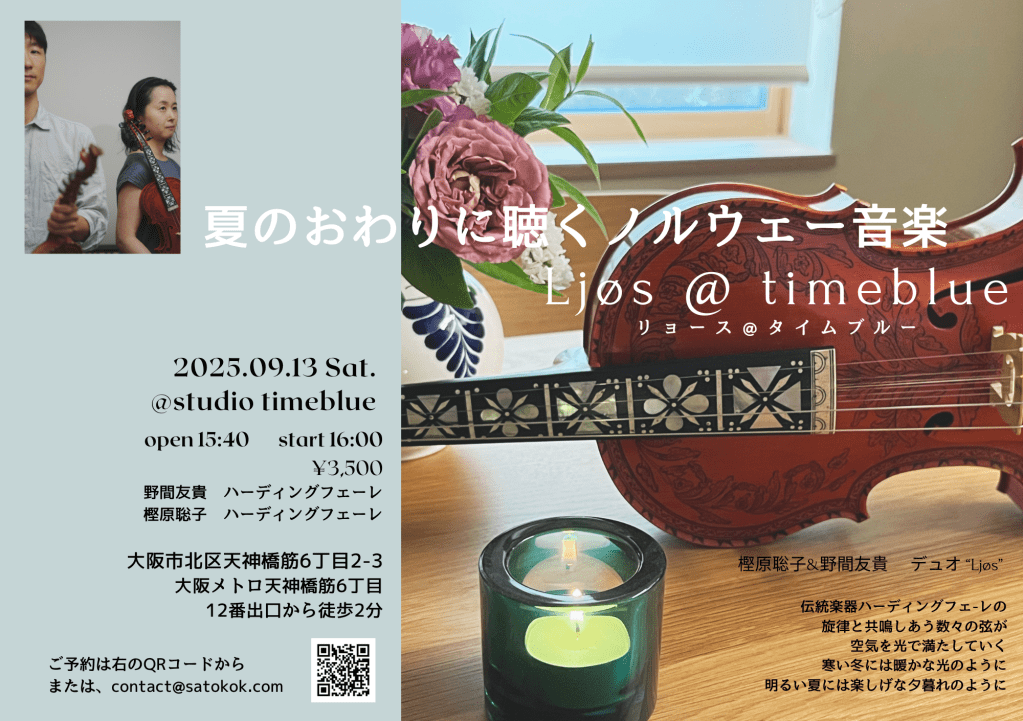 北欧音楽家の野間友貴さんとの2台のハーディングフェーレで演奏するLjøsリョースのコンサートを約1年ぶりに開催します!ハーディングフェーレは元々1台でも重音で演奏する楽器なので、2台になると華やかになりますが、野間さんとのデュオでは単に重音の華やかさだけでなく、種々多様なニュアンスと工夫がプラスされています!是非この機会にお楽しみください。
